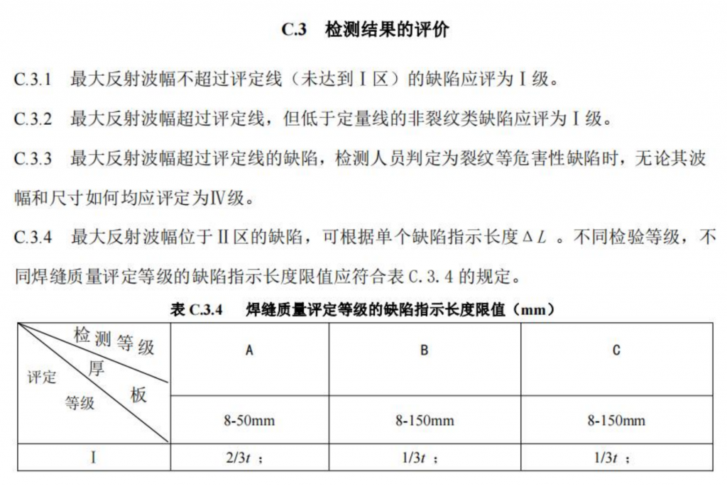 例如:在鋼結構焊縫超聲檢測的檢測、驗收與評定過程中,很多檢測人員存在誤區,現場檢測結果給出焊縫滿足驗收等級 2 級或驗收等級 3 級的要求。這主要是因為鋼結構焊縫超聲檢測技術依據的標準是《焊縫無損檢測 超聲檢測 技術、檢測等級和評定》GB/T 11345-2013,該標準推薦驗收等級按照《焊縫無損檢測 超聲檢測 驗收等級》GB/T 29712-2013 的有關規定執行。