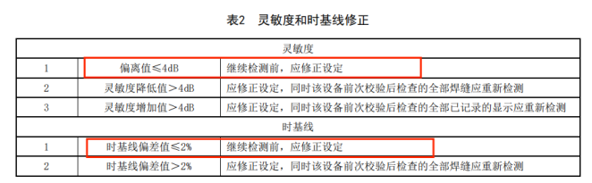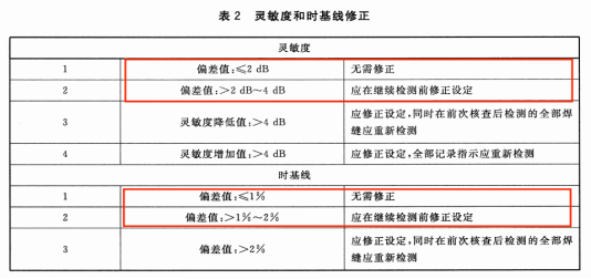 如果在核查過程中發現靈敏度偏差值大于2dB或時基線偏差值大于1%,應按表2進行修正。