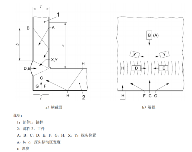 掃查面應足夠寬,以確保聲束覆蓋整個檢測區域(見圖2)。或者,如果能實現焊接接頭雙面掃查以確保聲束覆蓋整個檢測區域,可縮短掃查面寬度。掃查面表面應平滑,無焊接飛濺、鐵屑、油垢及其他外部雜質。掃查面表面的不平整度,不應引起探頭和檢測表面的間隙大于0.5mm。如果間隙超標,應修整掃查面表面。當遇到表面局部變化,如沿著焊趾掃查,導致探頭與表面的間隙大于1mm時,僅當在受影響部位增加至少一個其他角度的探頭進行補充掃查時才能被允許。該補充掃查應解決因間隙超標引起聲束未覆蓋整個檢測區域的問題。掃查面和聲束反射面應允許無于擾的耦合劑和反射物。
